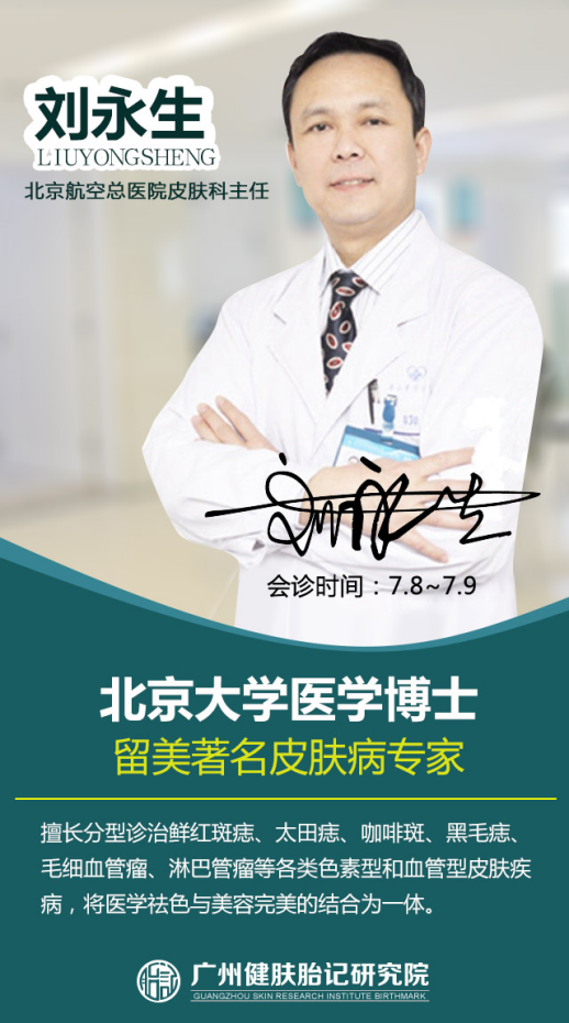 广州广州健肤作为华南地区独家胎记血管瘤研究院,定期邀请各家知名医院权威医生来院联合会诊,将会诊资源共享发挥到较大化。特于2017.7.8-7.9邀请北京航空总医院皮肤科主任刘永生教授联合会诊(北京医生挂号费、会诊费200元,广州当地医生挂号费、会诊费0元)。